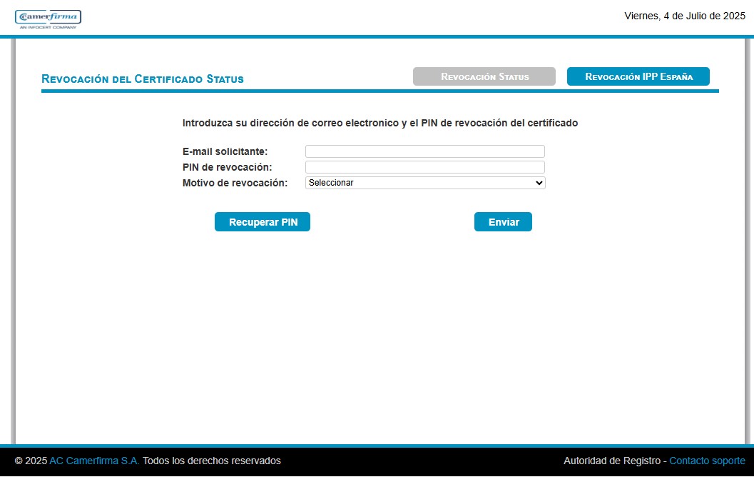 2.- Verá una página, donde deberá rellenar los datos: email asociado al certificado, Pin de revocación, etc.3.- El código de Revocación puede ubicarlo en el correo que le enviamos al descargar su certificado por primera vez. Si no tiene el PIN de Revocación puede recuperarlo, ingresando a su correo electrónico y luego haciendo click en Recuperar Pin dentro de la página de revocación.